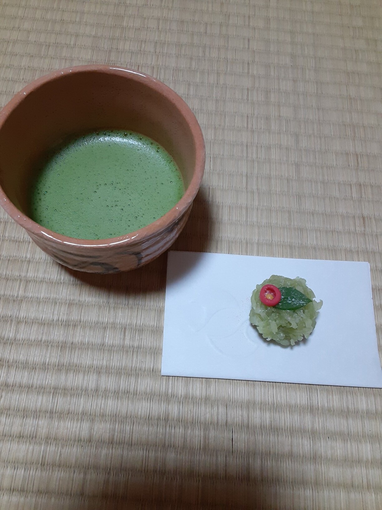お稽古2026年01月25日 22:37今日は朝から雪がちらつく中、二週間ぶりのお稽古でした。夜、最後の方が終わるころは雪が舞うほど降ってきました。今日の主菓子は高山堂の「寒椿」、中は粒あん、抹茶とほっこりできました。初稽古長生殿と和三玉