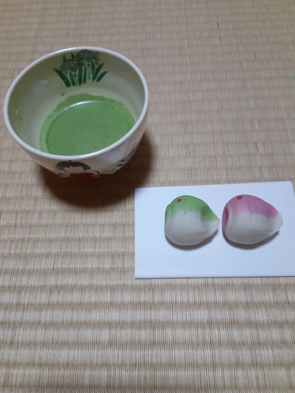 今日の主菓子は高山堂の「真鯉・緋鯉」なかはこしあんと白あん、美味しかったです。